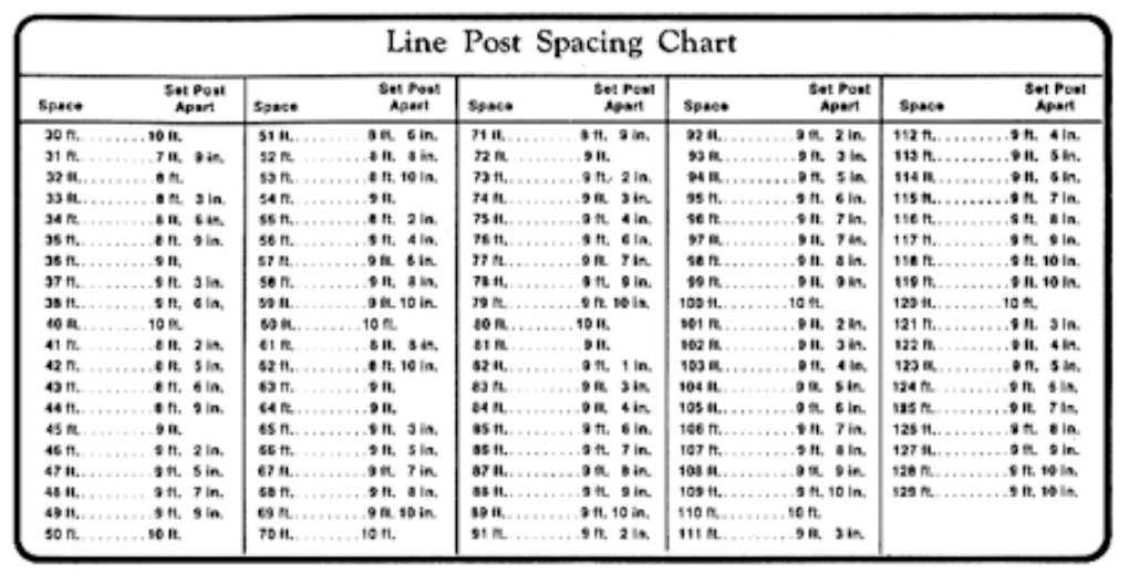 Mark the grade line on all line posts measuring from the top down as shown in Figure 2. Then measure the distance between terminal posts and check line post spacing chart (Figure 3 below) for exact distance to allow between line posts.