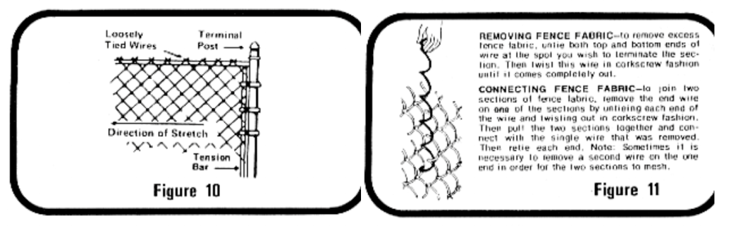 As you stretch the fabric test it for tension (it is stretched enough when it gives slightly). The top of the fabric should be located approximately 1⁄2″ above the top rail to insure proper height. After fence fabric is sufficiently tight, remove the excess the excess fabric as shown in Figure 11, and connect the tension bar to the post with tension bands. Also fasten the fabric to the top rail ad line posts with tie wires spaced approximately 18″ apart.