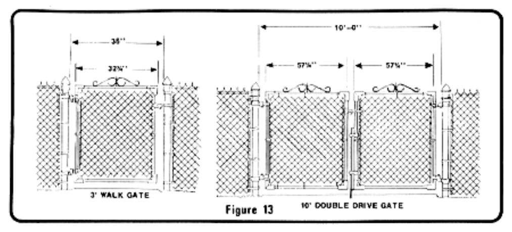 First, determine the location of end, corner, and gate posts (which are referred to as terminal posts). Distance between gate posts is determined by adding the actual width of the gate to an allowance for hinges and latches. Single walk gates require 3-3/4″ for hinges and latches and double drive gates require 5-1/2 “. For example, a 3-foot walk gate should measure 32-1/4″ wide. Adding 3-3/4″ to the width means that the distance between posts (inside face to inside face) should be 36”. (See Figure 13)